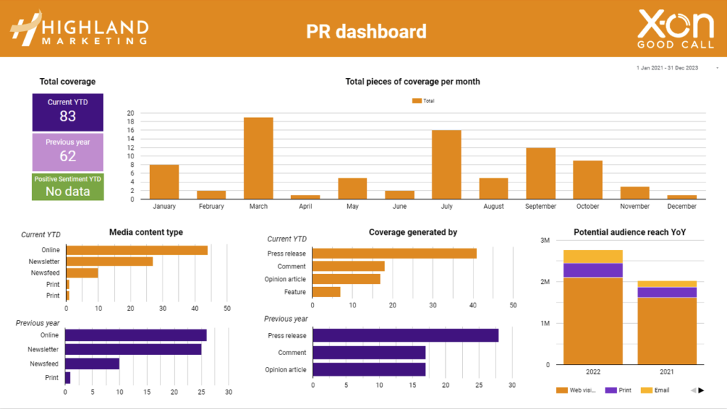 - Potential audience reach YoY – these graphs show the client the potential reach of all their coverage