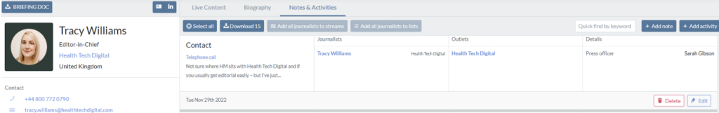 - If you click on the journalist and go to their full profile, in the notes section you will see all the details HM has on the journalist.